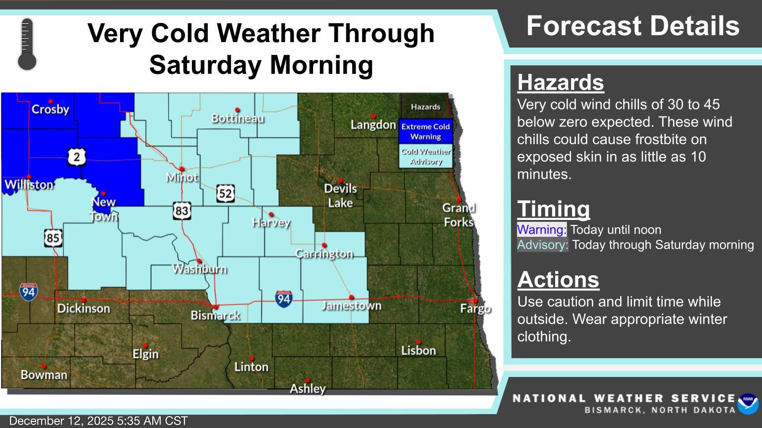 Cold weather headlines are in effect today through Saturday morning. The Extreme Cold Warning ends at noon today, otherwise the Advisory runs through Saturday morning.